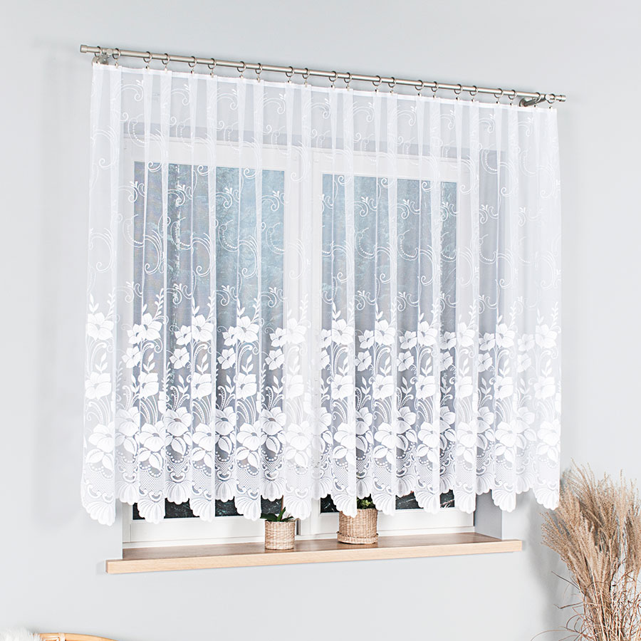 Jacquard függöny, ráncoló szalaggal ellátva. Anyaga fehér, nagyon szép mintákkal díszített. Ráncolást követően a függöny szélessége megfeleződik. Fuggony rovidites koldseg az 2.000,00 HUF. Kerem rendees kozben a megjegyzes mezoben beleirni hogy mennyit kell roviditeni.