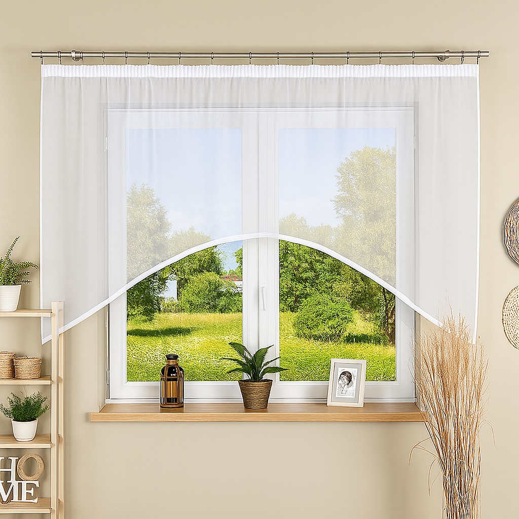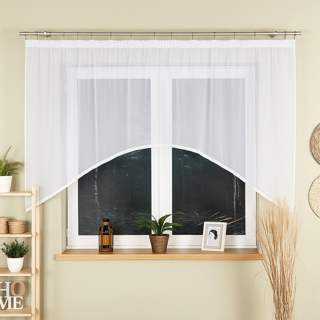 Magas minőségű fátyolszövetből készült, hófehér szaténnal szegélyezett függöny. A ráncoló szalaggal ellátott függöny anyaga nem gyűrődik. A megadott szélesség a ráncolás előtt értendő, a magasság a függöny legmagasabb pontján van mérve. Lehetőség van a megadott méretektől eltérő méretben való rendelésre. Ez esetben kérem e-mailben vegye fel velünk a kapcsolatot.Fuggony rovidites koldseg az 1.200,00 HUF